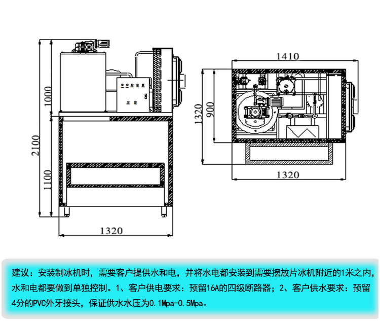 | 10 | 制冰機外型尺寸(長*寬*高) | 1410*900*1000 mm | 凈尺寸 |